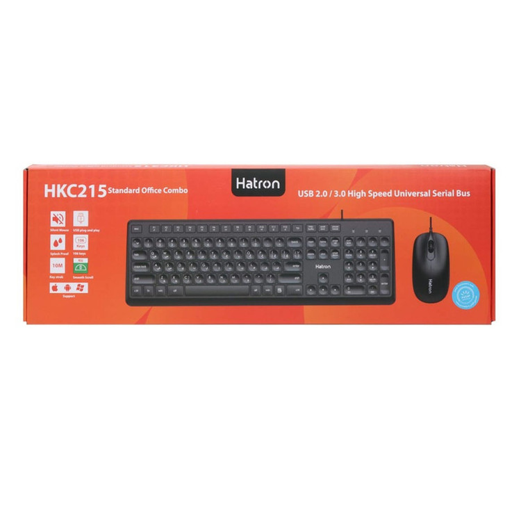 کیبورد و موس هترون مدل HKC215 از انواع کیبوردهای سیم دار هترون بوده که از طریق رابط USB به رایانه متصل می شود. بعد از اتصال به کامپیوتر و بدون نیاز به نصب درایور خاصی آماده به کار هستند. کلیدهای این کیبورد دارای فضای مناسب جهت قرارگیری انگشتان دست روی کلیدها و دارای حروف فارسی است و همانند سایر کیبورد های رایج دارای کلید های عددی در سمت راست خود است. این کیبورد در رنگ مشکی به بازار عرضه می شود و ظاهر آن مناسب برای استفاده در تمام فضاها است.جنس بدنهی آن Full ABS است و میتواند مقاومت خوبی در برابر انواع صدمات داشته باشد. طراحی و ساخت این کیبورد با ارتفاع مناسبی که دارد امکان تایپ سریع را فراهم کرده و از خستگی شما در استفاده طولانی مدت جلوگیری می کند. این کیبورد گزینه خوبی برای افرادی است که به دنبال کیبوردی استاندارد هستند. این کیبورد هترون دارای رنگ مشکی بوده و با کابل استاندارد 1/5 متری که دارد قابل استفاده در تمامی محیط های اداری و خانگی می باشد.