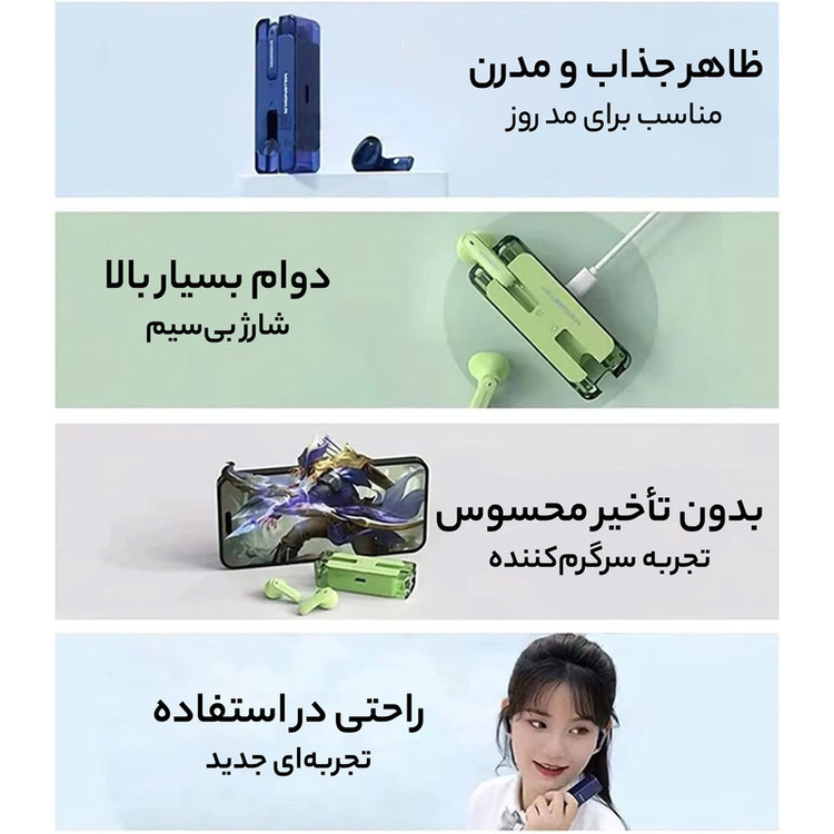 قابلیت تنظیم در دو حالت مخصوص بازی و مخصوص موزیک کیس شارژ شیشه ای دارای call noise reduction جهت حذف صدای مزاحم در حین مکالمه