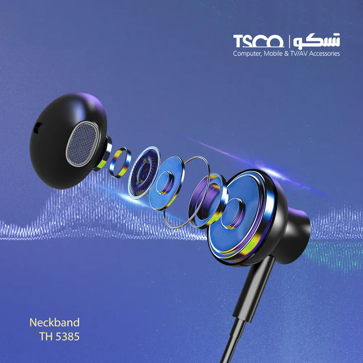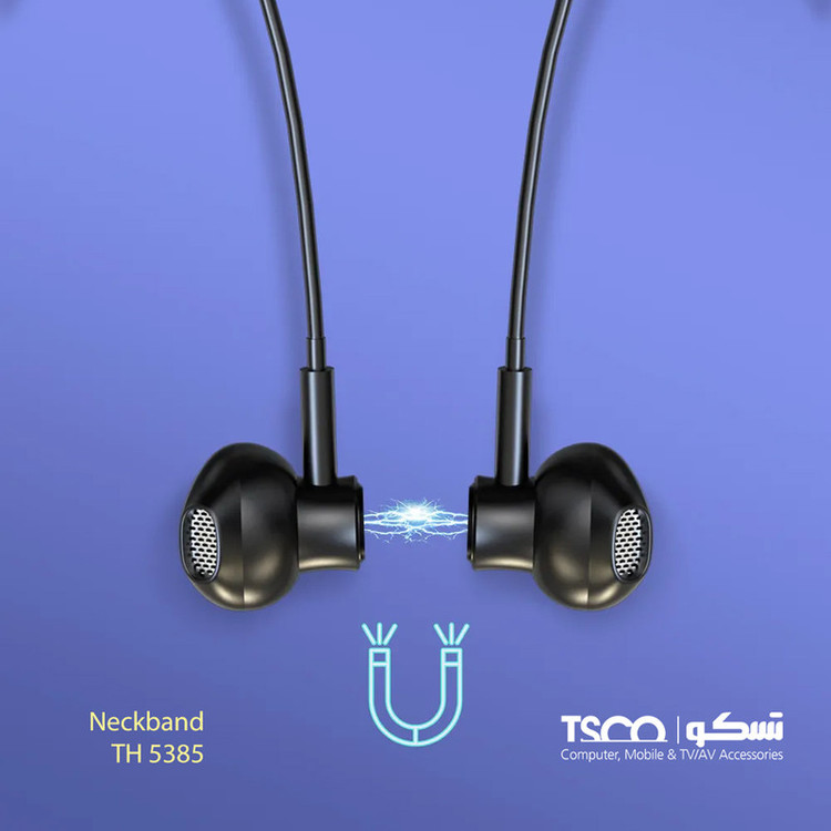 این ایرفون گردنی با طراحی ارگونومیک و حرفهای برای ساعتها استفاده مداوم بسیار مناسب است. میکروفون این محصول در بخش پایینی آن قرار گرفته است. جنس رابط کابل آن از ABS و PC بوده که با طول 0.5 متر با فاصله خوبی نسبت به شانه و گوش شما قرار میگیرد. از ویژگیهای خوبی که این هدفون گردنی دارد داشتن نشانگر LED است. این LEDها برای نمایش خاموش و روشن بودن ایرفون و زمان شارژ آن قرار داده شده است. اقلام همراه TH 5385 شامل یک کابل شارژ و دفترچه راهنما است. گوشیهای این هدفون طرح آیفونی بوده و از جذابیت خاصی برخوردار است. با استفاده از کلیدهای کنترلی تعبیه شده روی TH 5385 به سهولت با آن کار کنید. برای زدن آهنگ قبلی قسمت کم شدن آهنگ را یک ثانیه نگه دارید. برای اینکه بخواهید به آهنگ بعدی بروید علامت زیاد شدن صدا را یک ثانیه نگه دارید. در بخش سری گوشیها از سیلیکون مرغوب استفاده شده تا حس راحتی را به گوشهای شما هدیه دهد. این ویژگی باعث میشود پس از ساعتها گوش دادن به موسیقی احساس خستگی نداشته باشید. طراحی ارگونومیک و زیبای این هدفون به شما حس خیلی خوبی القا خواهد کرد. نوع اتصال هدفون گردنی تسکو از نوع بلوتوثی و ورژن 5 بوده که اتصال بدون قطعی را برای شما به ارمغان میآورد. تا فاصله 15 متری از این هدفون به راحتی میتوانید متصل شوید. نوع باتری استفاده شده در این هدفون گردنی از نوع لیتیومی است. ظرفیت 110 میلیآمپرساعتی این هدفون بسیار بادوام بوده و ساعتها به شما شارژ خواهد داد. پس از هر بار شارژ این هدفون تا 7 ساعت امکان پخش موسیقی خواهد داشت. برای مکالمه نیز تا 6 ساعت میتوانید روی این محصول شرکت تسکو حساب کنید. زمانی که هدفون تسکو را به شارژ میزنید تا 2 ساعت بعد شارژ آن کامل میشود. در حالت استندبای که استفادهای از دستگاه نمیشود، تا 90 ساعت روشن میماند. 5385 کلیه دستگاههای مجهز به بلوتوث را پشتیبانی میکند. از سمت دیگر پروفایلهای قابل پشتیبانی برای این هدفون ACC و SBC هستند. حساسیت اسپیکر برابر 3±100 دسیبل، حساسیت میکروفون نیز حدود 42 دسیبل است. در بخش مقاومت اسپیکر 32 اهم و میکروفون 300 اهم مقاومت دارد. توان واقعی دستگاه نیز بین 3-5 مگاوات است. مشخصهای که سبب میشود TH 5385 محصولی پرتقاضا باشد، وضوح صدای بالایی است که این محصول دارد.
