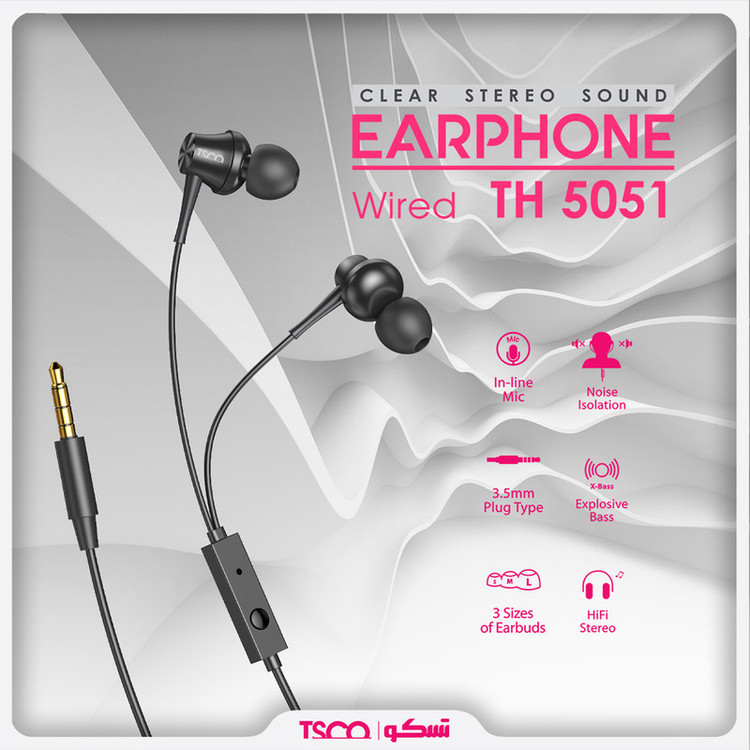 ایرفون «TH 5051» محصولی دیگر از TSCO است که جزو هدفونهای توگوشی یا ایرفون (Earphone) بهشمار میرود. به منظور استفاده از این محصول کافی است جک ایرفون 3.5 میلیمتری آن را به گوشی هوشمند خود متصل کرده و از تجربه گوش دادن به موسیقی لذت ببرید؛ با استفاده از این محصول به راحتی میتوانید به تماس های تلفنی خود پاسخ دهید و همچنین با استفاده از طول کابل 1.2 متری این محصول، استفاده از آن آسانتر شده و میتوانید به راحتی گوشی موبایل خود را درون جیب و یا کیف خود قرار دهید.