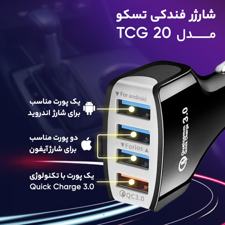 شارژرهای فندکی یک راه رایج برای جلوگیری از تمام شدن شارژ باتری گجتهای هوشمند شما در طول روز و ساعاتی که به پریز برق دسترسی ندارید، محسوب میشوند. شما با استفاده از یک شارژر فندکی میتوانید باتری گوشیهای موبایل، دوربین دیجیتال، موزیک پلیر و دیگر دستگاههای از این قبیل خود را داخل خودرو، بدون نیاز به استفاده از پریز برق، شارژ کنید. شارژرفندکی «TCG 20» یکی از محصولات شرکت «تسکو» (TSCO) است که با استفاده از پلاستیک ساخته شده است. این شارژر فندکی با درگاه فندکی اغلب خودروها سازگاری دارد. روی سطح این شارژر 4 درگاه خروجی USB تعبیه شده که شدت جریان خروجی در آنها به 7 آمپر میرسد. بنابراین شما میتوانید با این شارژر فندکی علاوه بر شارژ باتری انواع گوشیهای موبایل، باتری تبلت یا آیپدتان را هم به راحتی شارژ کنید. ولتاژ ورودی در این محصول 12 تا 24 ولت است. پس برای استفاده از آن کافی است شارژر را به طور مستقیم به درگاه فندک داخل خودرو متصل کنید. سپس دستگاه مورد نظر را با استفاده از یک کابل USB به شارژر متصل کرده و منتظر بمانید تا باتری آن شارژ شود. خوشبختانه به همراه این محصول یک کابل microUSB وجود دازد. این شارژ فندکی یک انتخاب مناسب برای افرادی خواهد بود که مجبور هستند ساعتهای زیادی از روز را داخل خودرو باشند و دسترسی مناسبی به پریز برق ندارند.