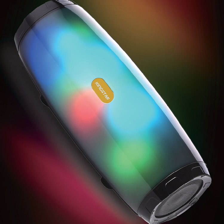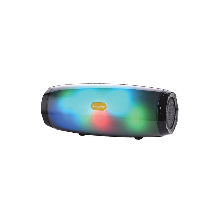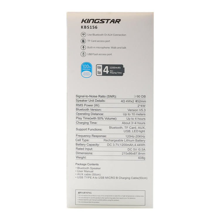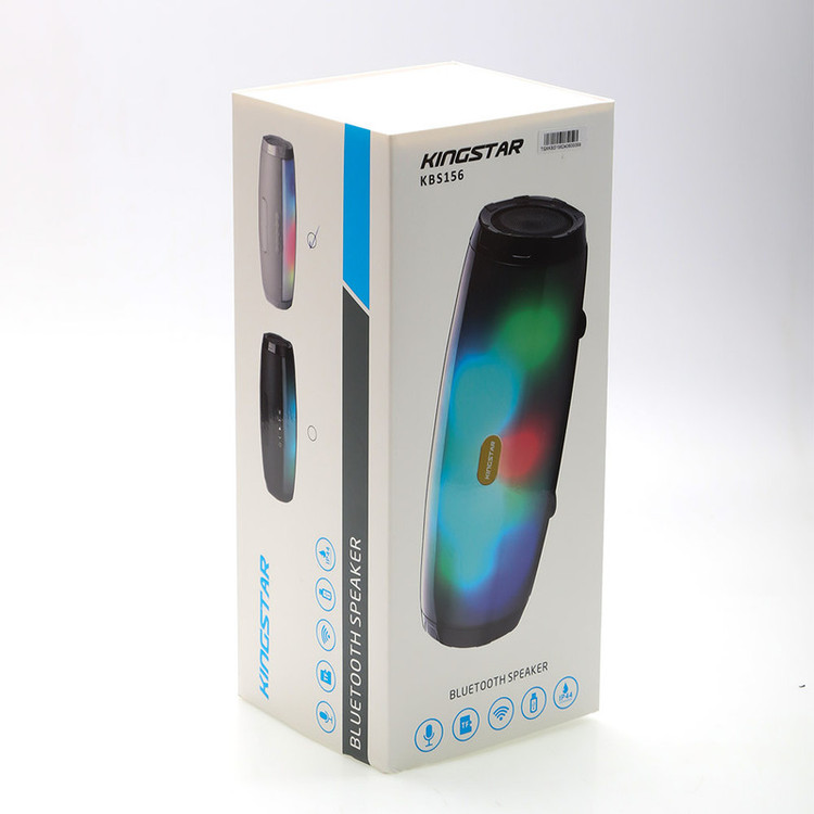 اسپیکر بلوتوثی قابل حمل مدل KBS156 از محصولات جدید کمپانی کینگ استار است. از جمله ویژگیهای بصری این اسپیکر میتوان به بدنه پلاستیکی به ابعاد 215*88*86 میلیمتر و وزن 608 گرمی در کنار نوپردازی RGB آن اشاره کرد. این ابعاد موجب شده تا این محصول تبدیل به یک کالای قابل حمل و جذاب شود. در قسمت بالایی این اسپیکر 5 دکمه تعبیه شده که شامل دکمه خاموش و روشن، کاهش و افزایش صدا، PLAY/PUSE و تغییر نورپردازی است. همچنین در قسمت پشتی آن با کنار زدن پوشش لاستیکی، درگاه Micro Usb جهت شارژ اسپیکر و ورودی های کارت حافظه MicroSD (با فرمت FAT32)، درگاه USB (با فرمت FAT32) و جک 3.5 میلی متری را مشاهده خواهید نمود. KBS156 در 2 رنگ مشکی و خاکستری، دارای 10 مدل نورپردازی متفاوت نیز میباشد. در تشریح ویژگی های داخلی محصول، میتوان به وجود 2 بلند گوی 4 واتی (در مجموع 8 وات توان خروجی) با قطر 52 میلی متر و مقاومت 4 اهمی اشاره کرد. همچنین بلوتوث نسخه 5.3 با محدوده عملکرد 10 متر، امکان استفاده از این تکنولوژی در فضای باز را به ما میدهد. وضوح صدای پویا و شفاف در بخش جانبی اسپیکر هنگام پخش موسیقی، توجه هر کاربری را به خود جلب میکند. وجود میکروفون و قابلیت مکالمه از طریق اسپیکر از دیگر ویژگی های این محصول میباشد. مدت زمان پخش اسپیکر با صدای 50 درصد بیش از 4 ساعت بوده و مدت زمان مورد نیاز جهت شارژ اسپیکر از صفر تا صد حدود 3 الی 4 ساعت میباشد. منبع انرژی این کالا باتری لیتیوم پلیمری 3.7 ولت 1200 میلی آمپری است. در نگاه تخصصی تر، این اسپیکر با نسبت سیگنال به نویز 90 دسی بل و پاسخ فرکانسی 120Hz-20KHz از اسپیکر های با کیفیت بازار به شمار میآید. همچنین میزان حداکثر ورودی شارژ آن 5V/0.5A است.همچنین این اسپیکر دارای استاندارد IP44 می باشد که این اسپیکر را در برابر ذرات بیشتر از 1 میلی متر و همچنین پاشش مستقیم آب مقاوم می کند.